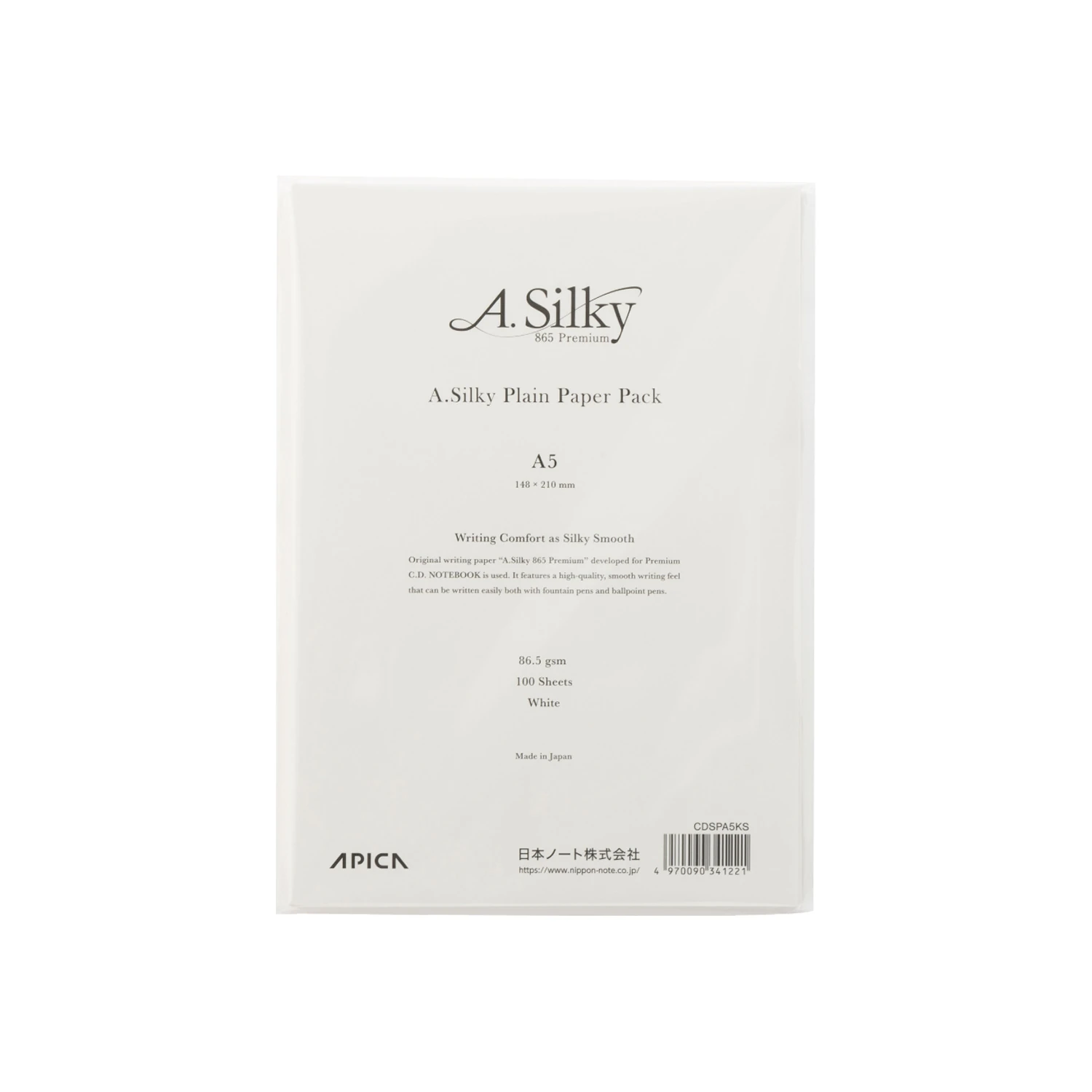 Apica Silky A5 Plain Paper Pack: dolma kalem uyumlu. 148x210mm A5 boyutunda, 86,5 gsm, 100 sayfa, beyaz.