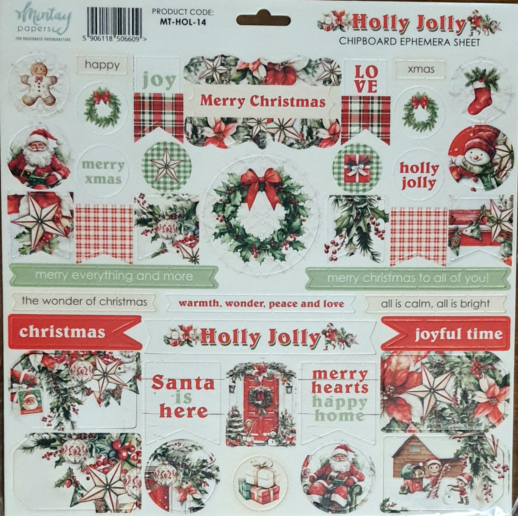 Mintay Papers, Holly Jolly Chipboard Ephemera Sheet, 42 pcs, 12″ x 12″