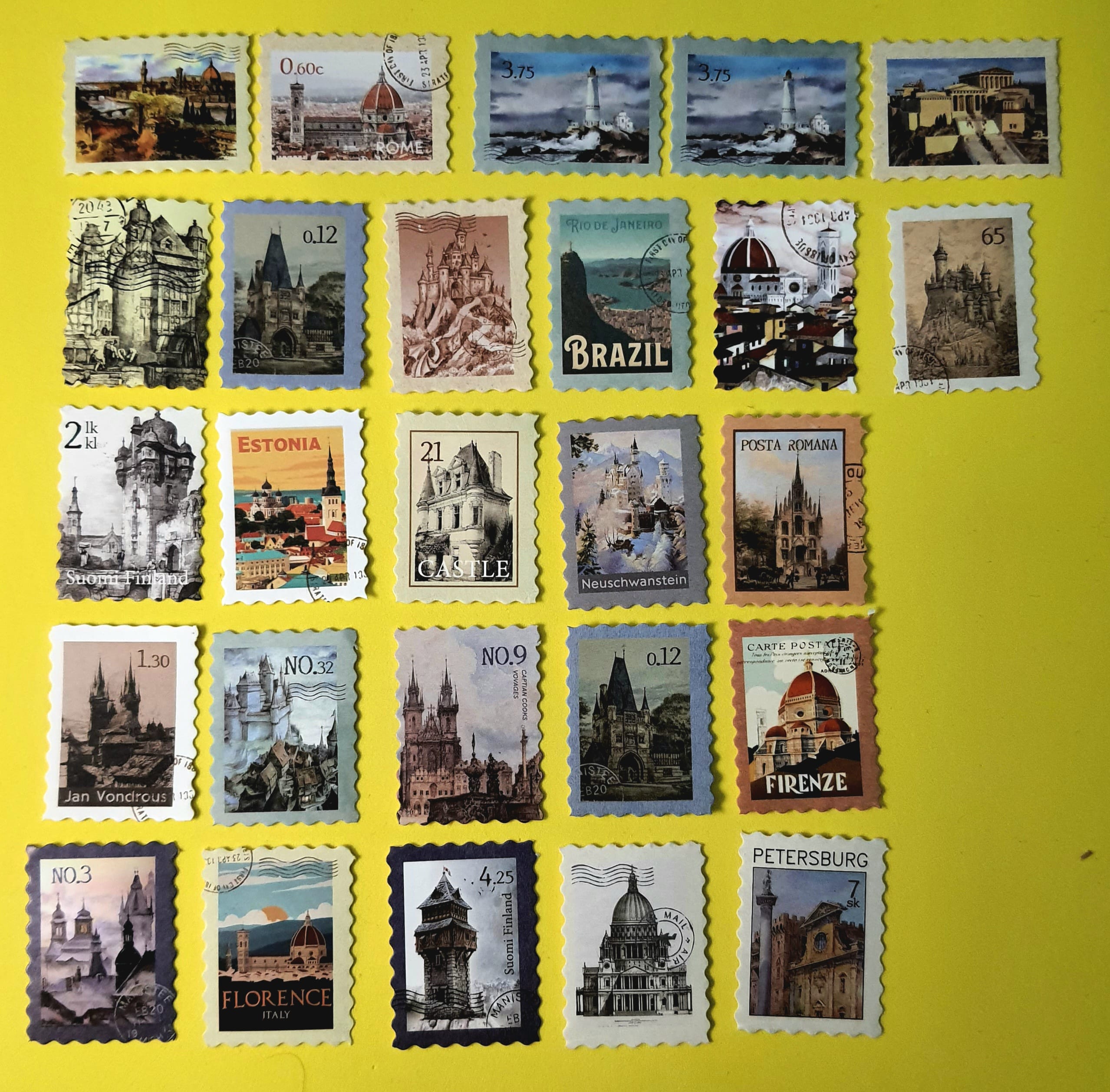 Ülke ve şehir yapılar temalı, pul şeklinde etiketlerdir. Her bir etiket, 100x150mm boyutlarındadır. Paket içinde 48 adet mevcuttur.